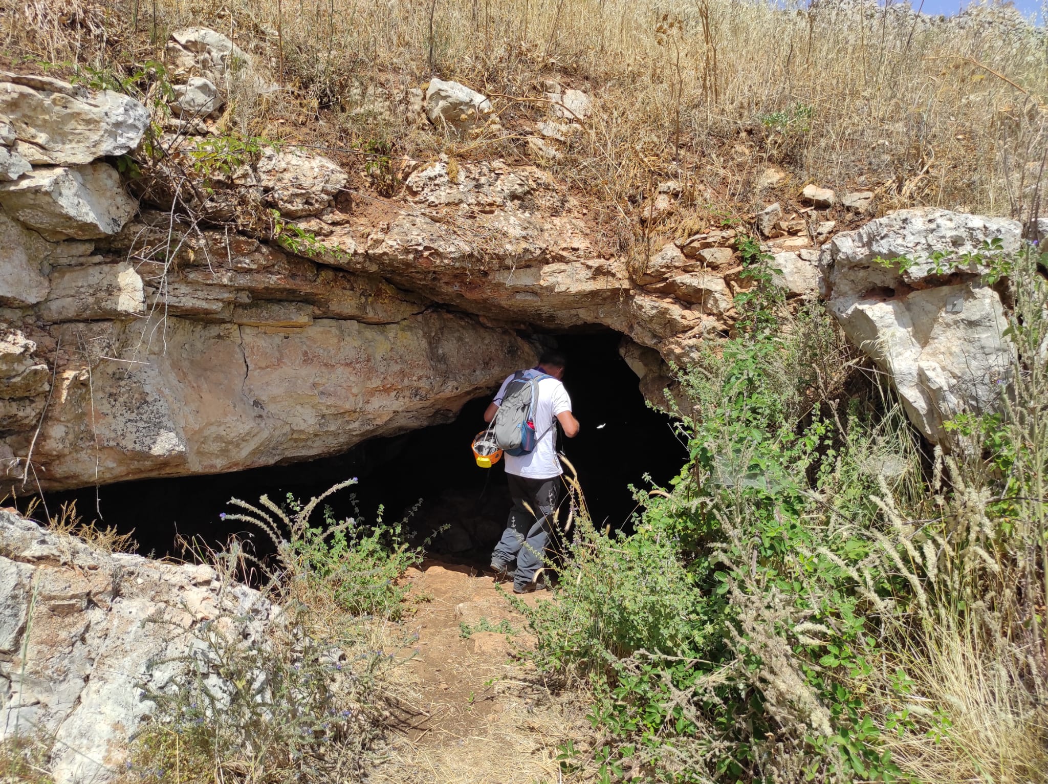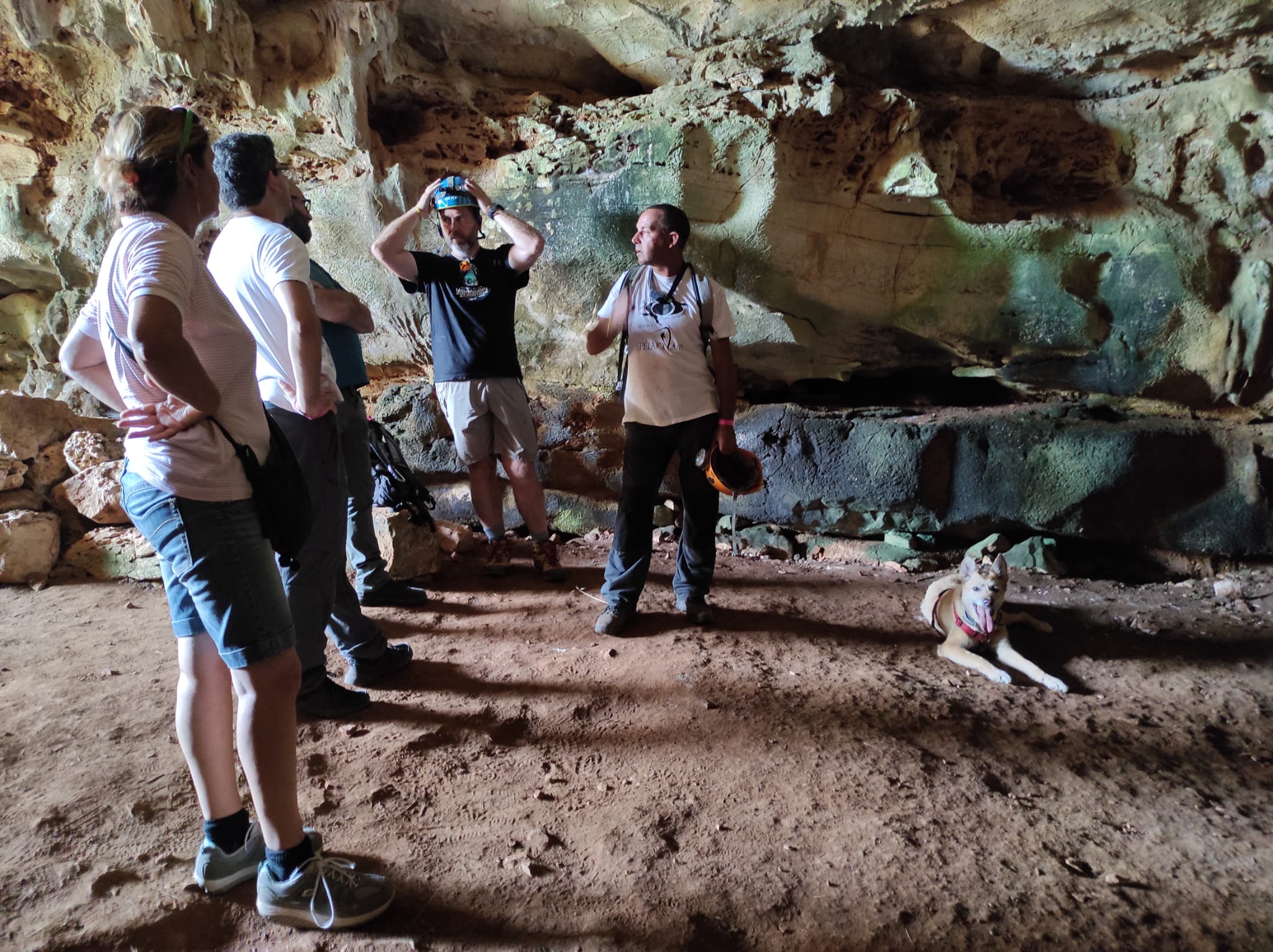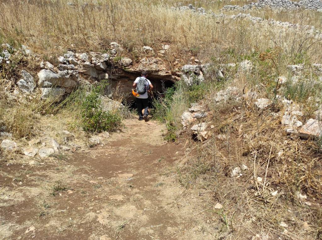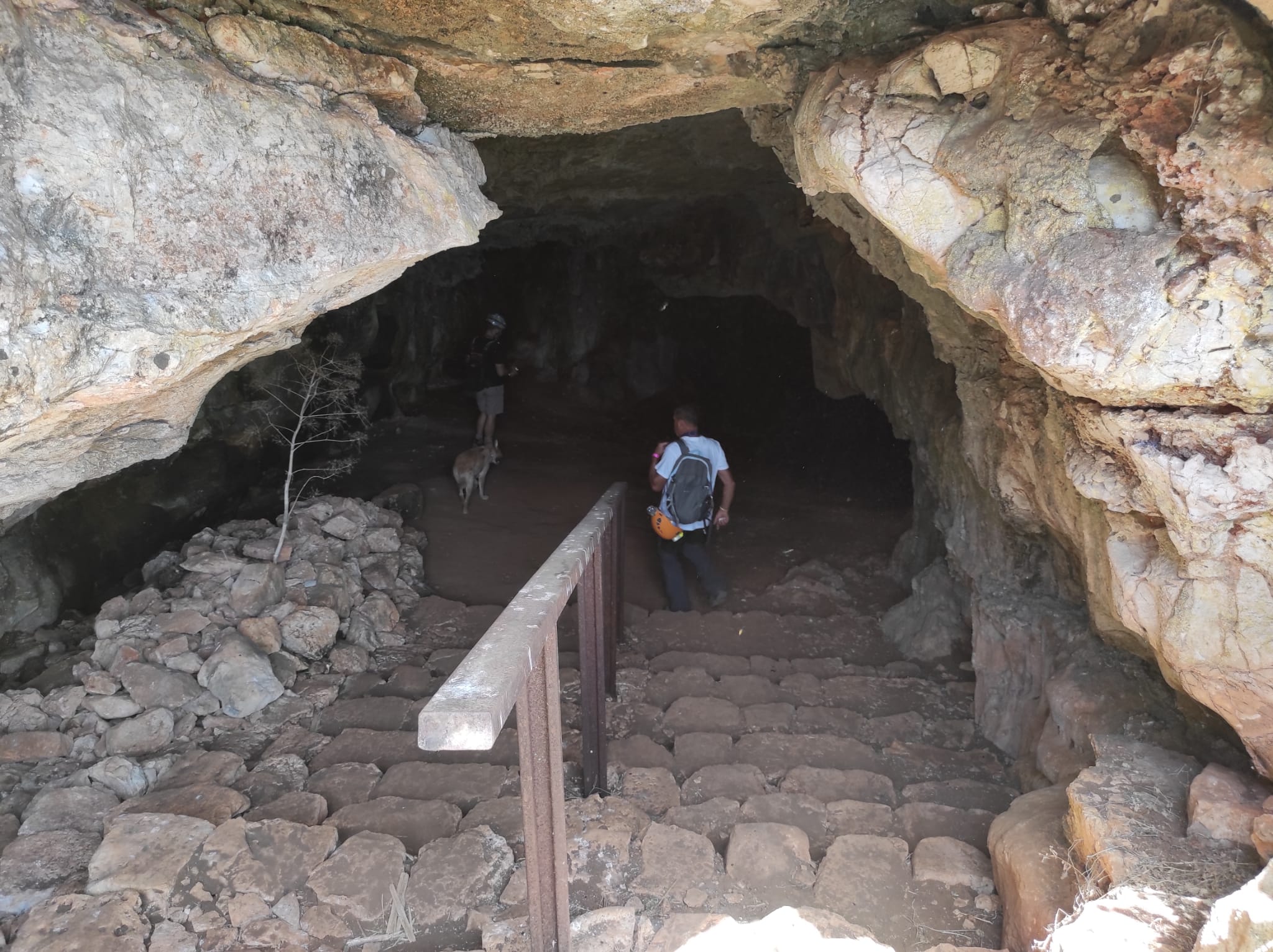 Parcheggiate nuovamente le macchine, con un breve ma bollente tratto a piedi ci portiamo all’ingresso della Grotta Prima. Entriamo nella sala che forma la grotta, c’e’ un corrimano che aiuta nella discesa. Vado in giro a curiosare tra i vari buchi. Luna mi guarda interdetta poi si stende a terra a godersi il fresco. Terminata la visita facciamo ritorno alle macchine per spostarci alla grotta dell’uomo, quella famosa, del teschio concrezionato, per intenderci. L’ingresso non e’ permesso a nessuno, ci spiega Antonio, ma potremo consolarci visitando la vicina grotta delle Capre. Lasciate le macchine sul bordo strada iniziamo il pellegrinaggio rovente verso la grotta piu’ famosa.