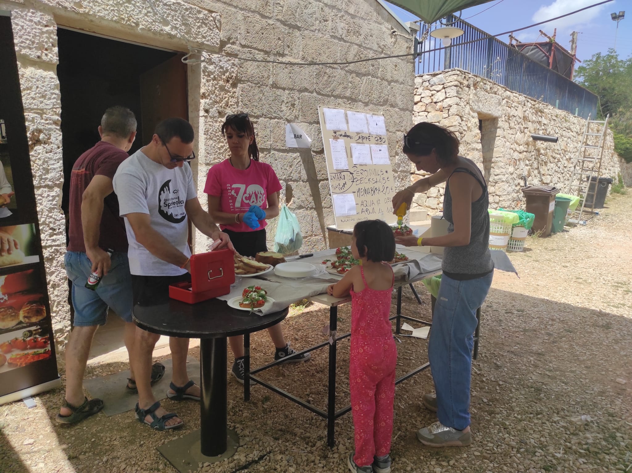 Davanti alla porta del bar viene messo un tavolino che funge da cassa e ritiro delle vettovaglie. Ognuno di noi si serve e poi mangiamo allegramente tutti assieme.