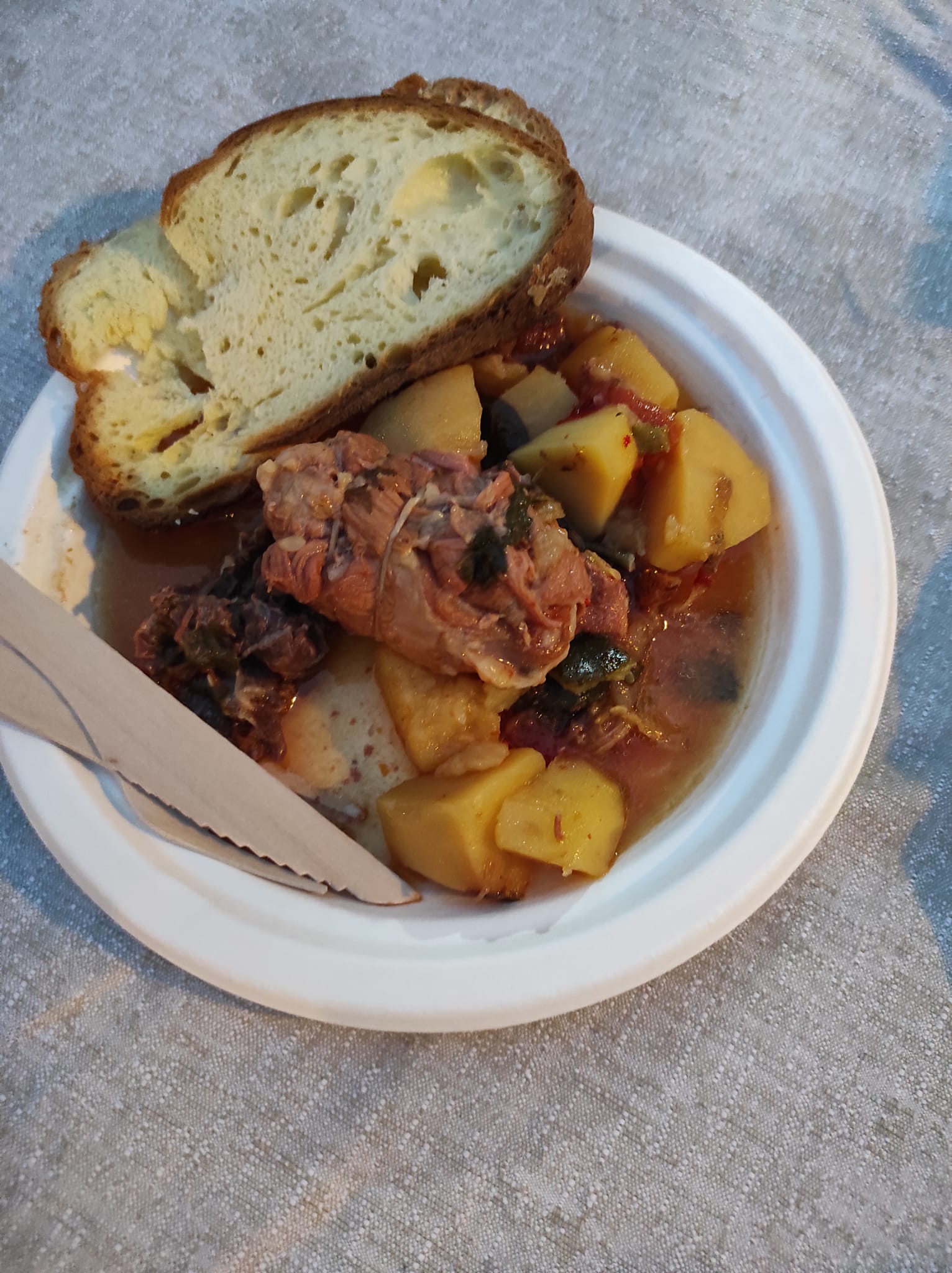 Arriva la cena! sono tra i primi ad approfittare delle delizie che sono state preparate per noi. Il piatto che piu’ apprezzo sono degli involtini, sono semplicemente fantastici. Me ne faccio ripetere il nome una decina di volte ma ricordo solo che sono “braciole”. Pero’ almeno ho imparato grossomodo come vengono preparate. Intanto queste sono di carne di cavallo, vengono confezionate legandole con lo spago e poi messe dentro dei vasi di coccio insieme ad un monte di verdure. Il vaso di coccio viene poi sigillato e messo in forno. Dopo molte ore di cottura il vaso viene tirato fuori e fatto freddare un poco. Quello che ne esce fuori, vi posso assicurare, e’ una autentica delizia.