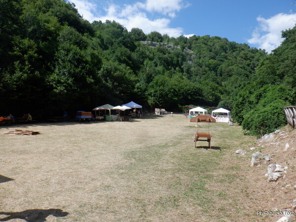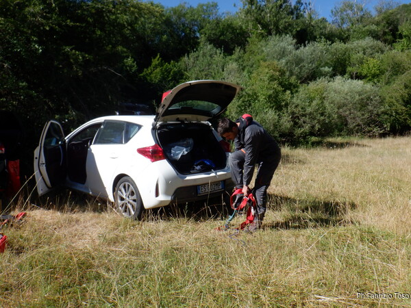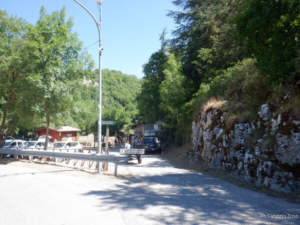 Mi vesto in maniera minimale, poi metto tutto nello zaino e costringo i miei amici a spostarsi all’ombra onde evitare la sublimazione per il caldo torrido. Mentre loro terminano i preparativi distribuisco della pizza presa al forno di Tagliacozzo che e’ ottima da consumare finche’ e’ fresca.