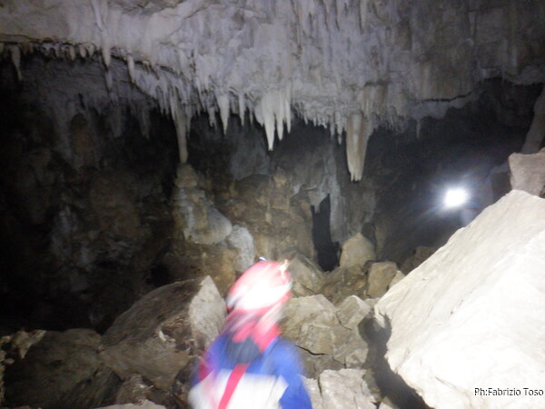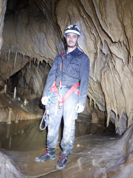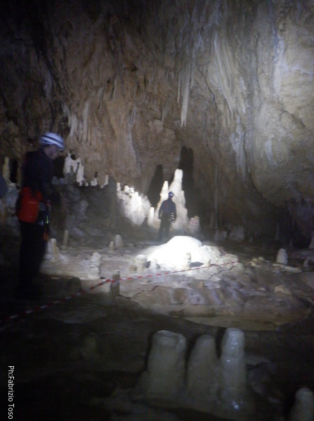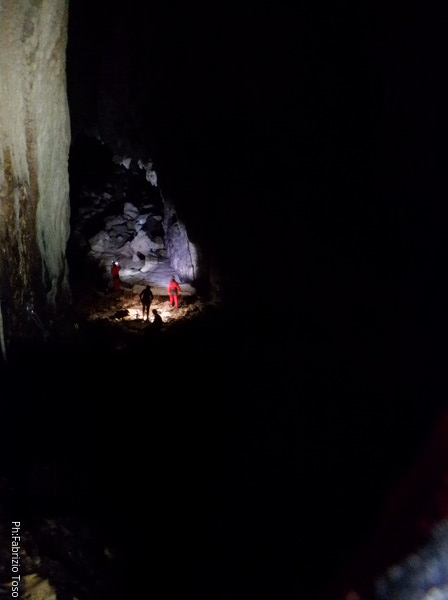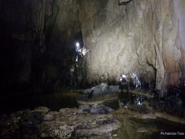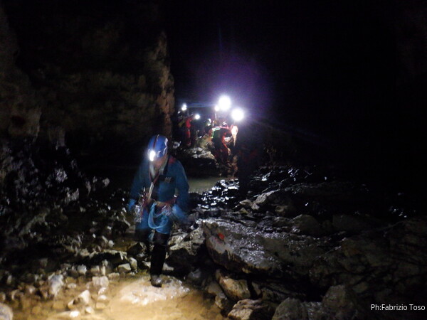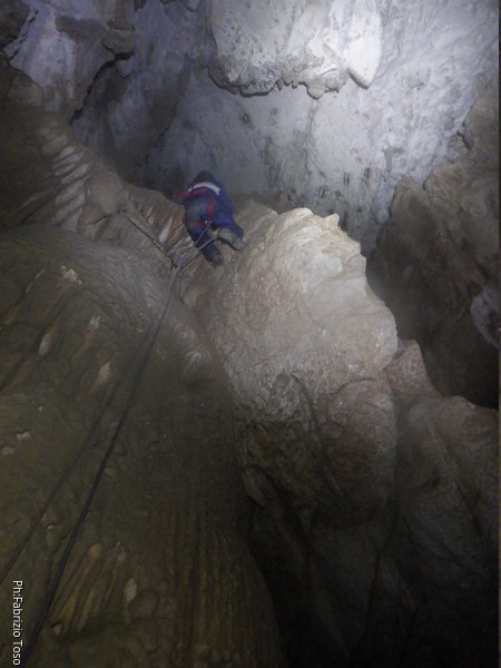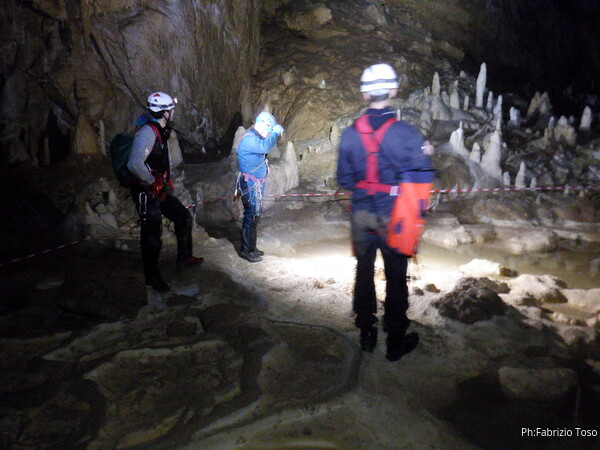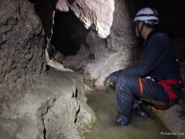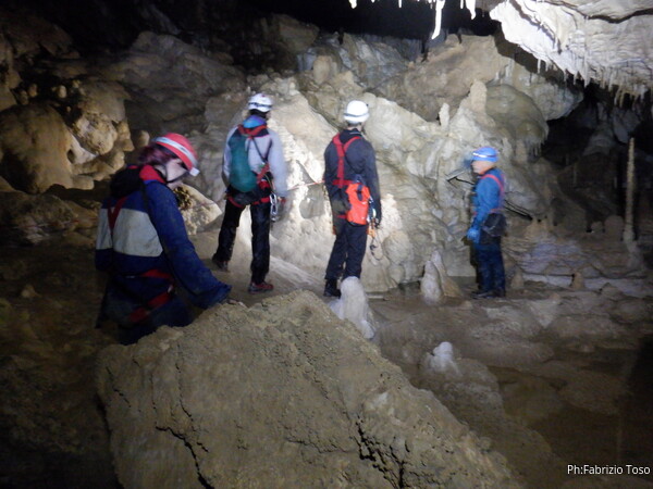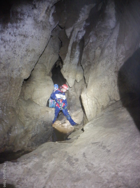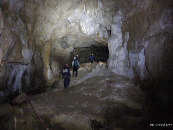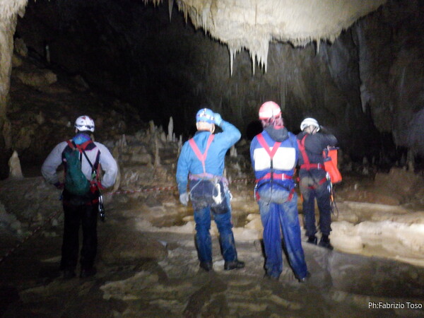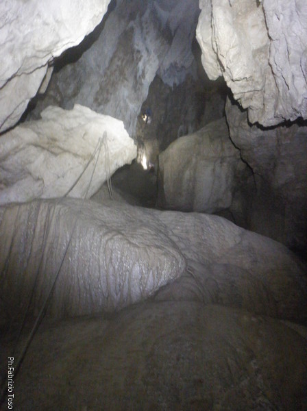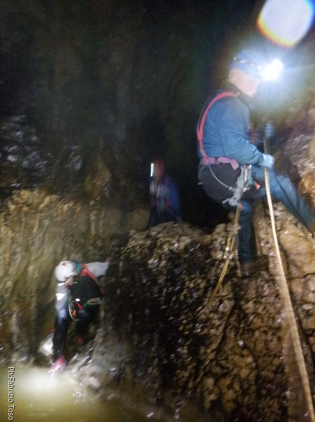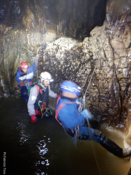 Mentre io sono impegnato nella vestizione chiedo a Giancarlo di accompagnare i miei amici, alla loro prima visita, al piccolo ramo laterale. Lo chiamo “ramo fossile”, quando invece e’ piu’ che attivo, ma Giancarlo mi capisce ugualmente. Mentre termino la vestizione passa e va anche il gruppetto teramano.