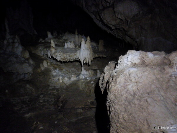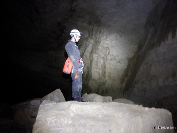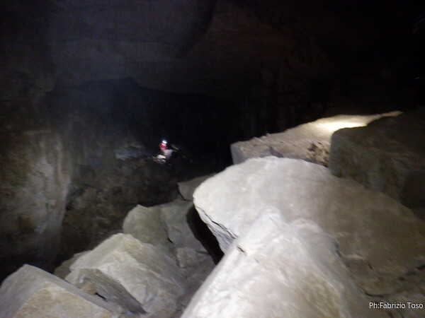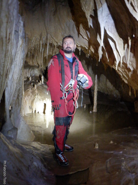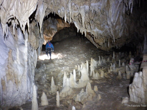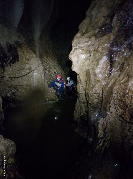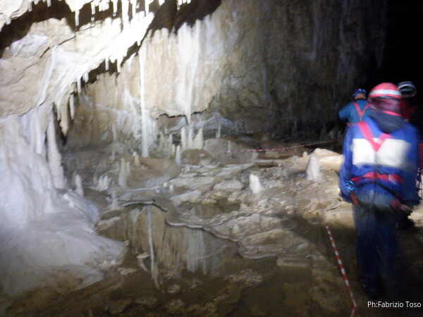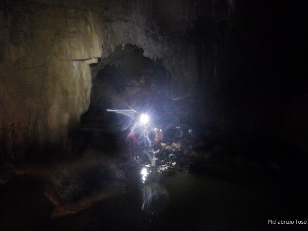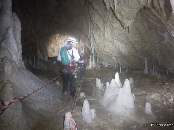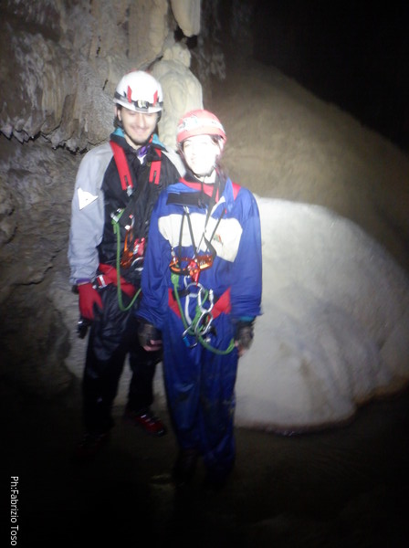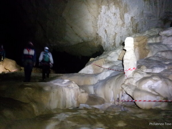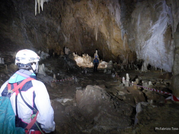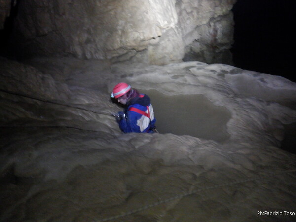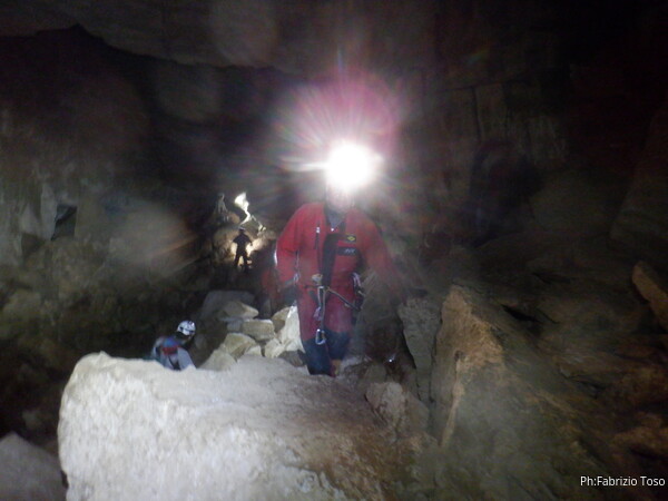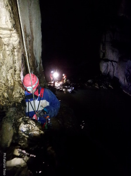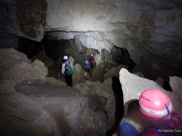 Mentre io sono impegnato nella vestizione chiedo a Giancarlo di accompagnare i miei amici, alla loro prima visita, al piccolo ramo laterale. Lo chiamo “ramo fossile”, quando invece e’ piu’ che attivo, ma Giancarlo mi capisce ugualmente. Mentre termino la vestizione passa e va anche il gruppetto teramano.