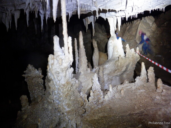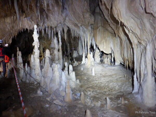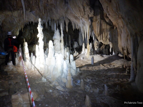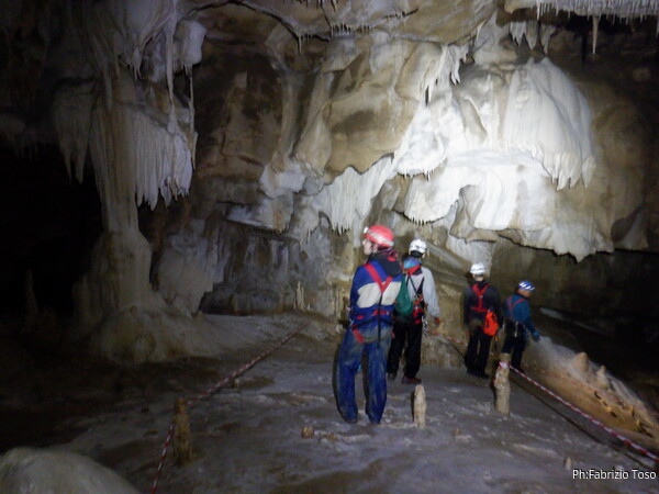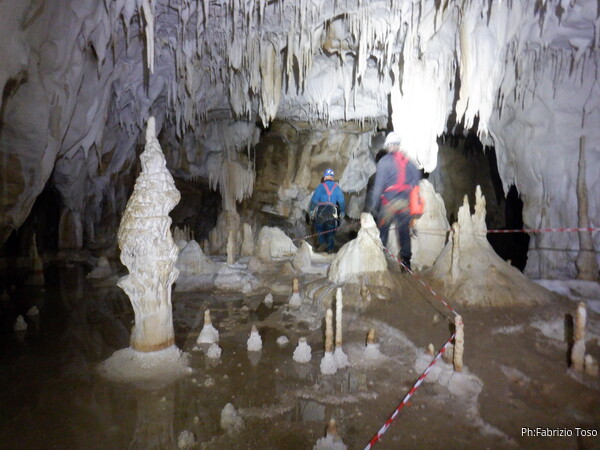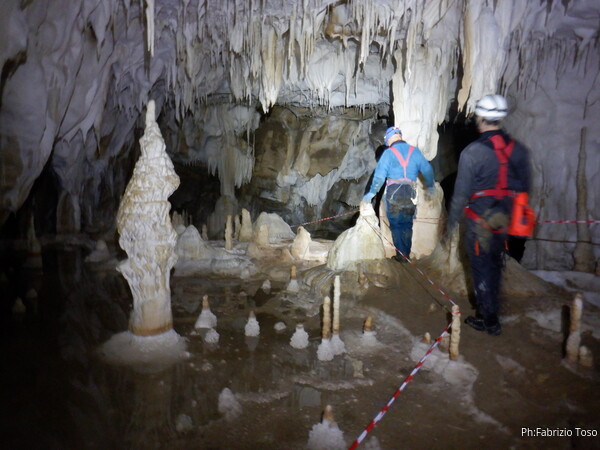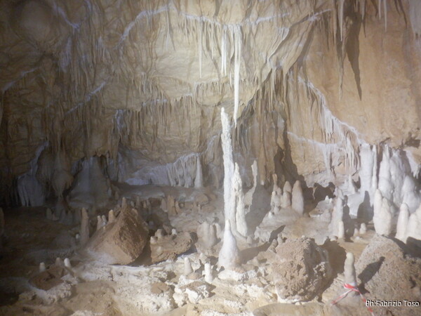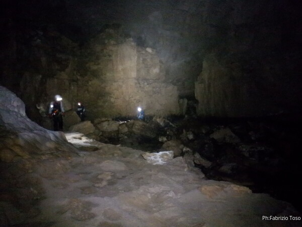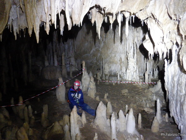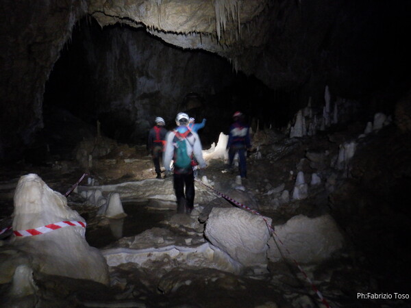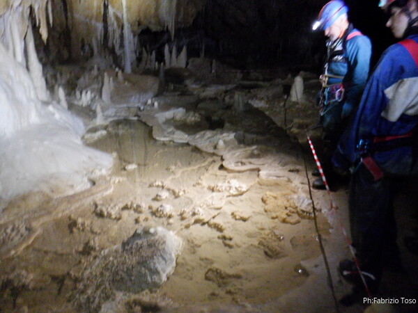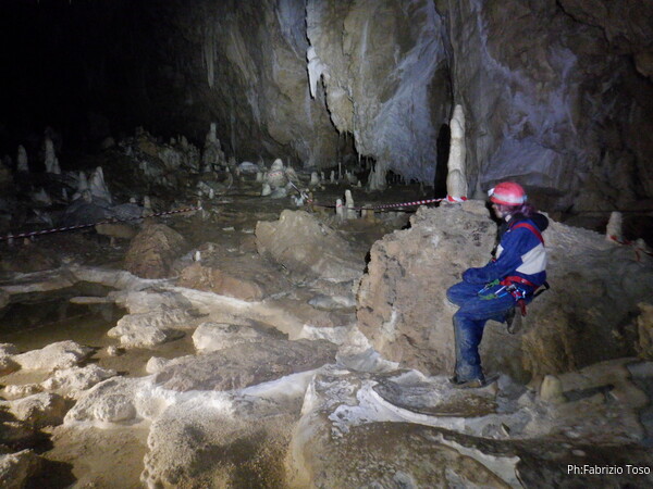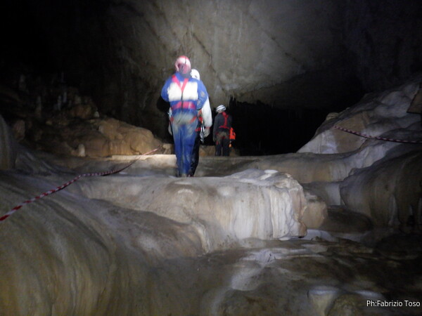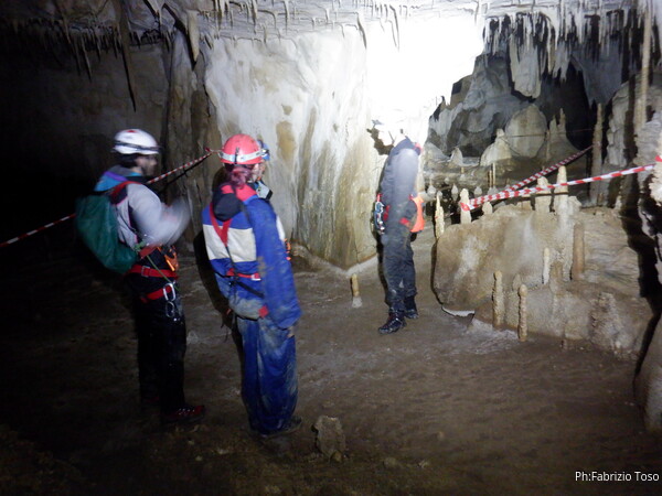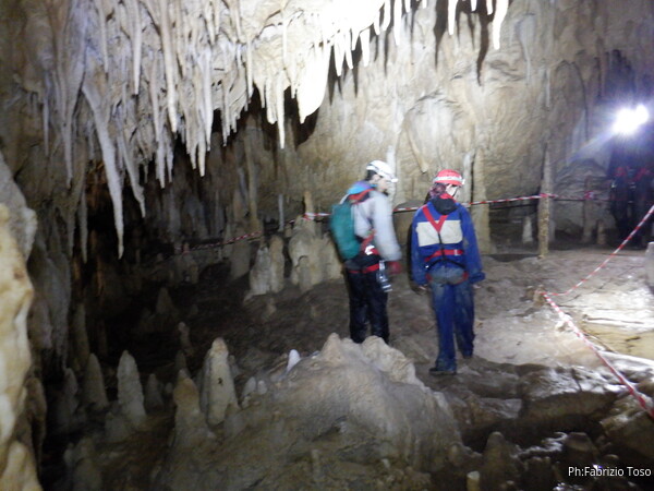 Mentre io sono impegnato nella vestizione chiedo a Giancarlo di accompagnare i miei amici, alla loro prima visita, al piccolo ramo laterale. Lo chiamo “ramo fossile”, quando invece e’ piu’ che attivo, ma Giancarlo mi capisce ugualmente. Mentre termino la vestizione passa e va anche il gruppetto teramano.