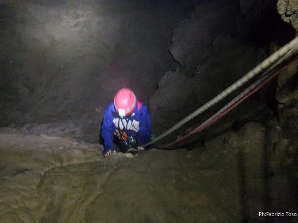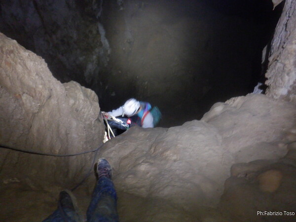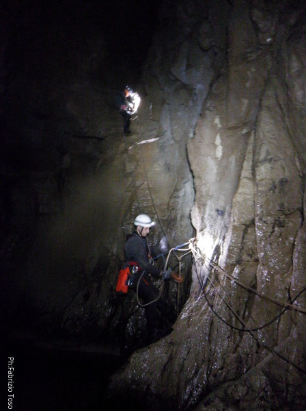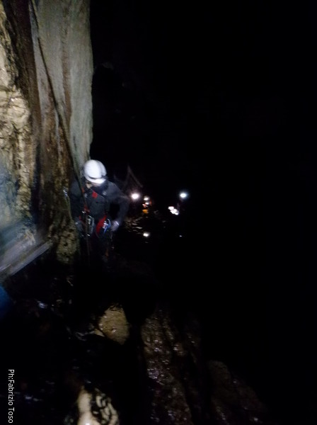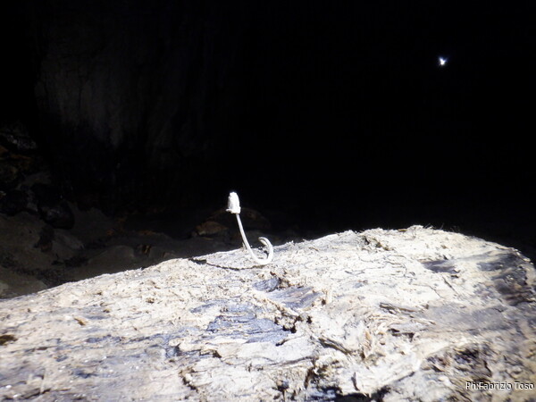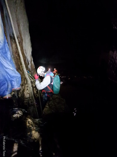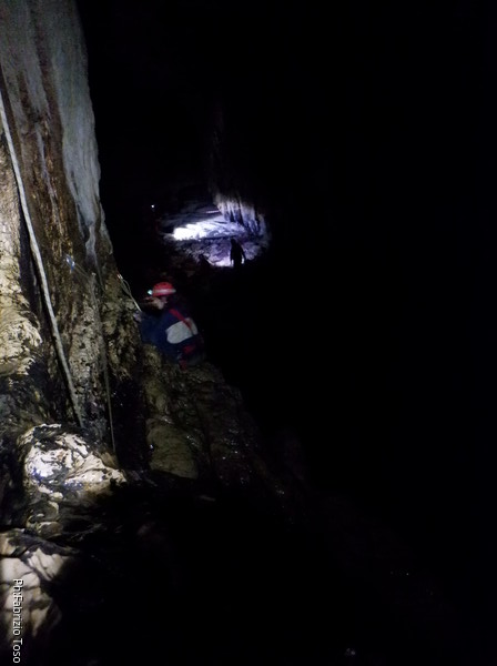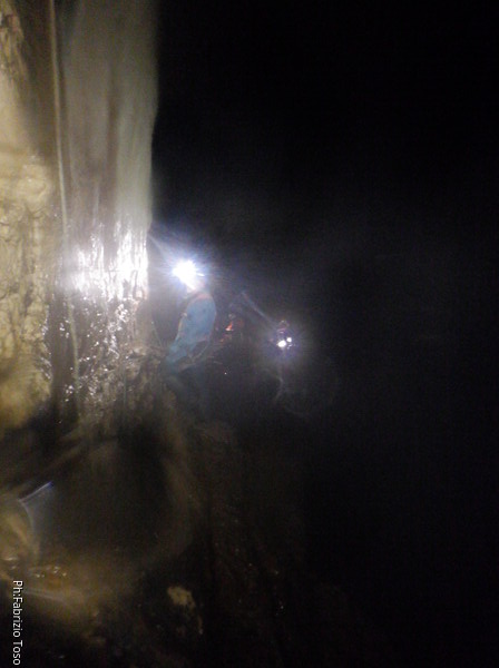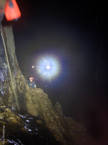 Eccola che passa il frazionamento finale, in fondo le luci indicano che l’altro gruppo ha ripreso il cammino.