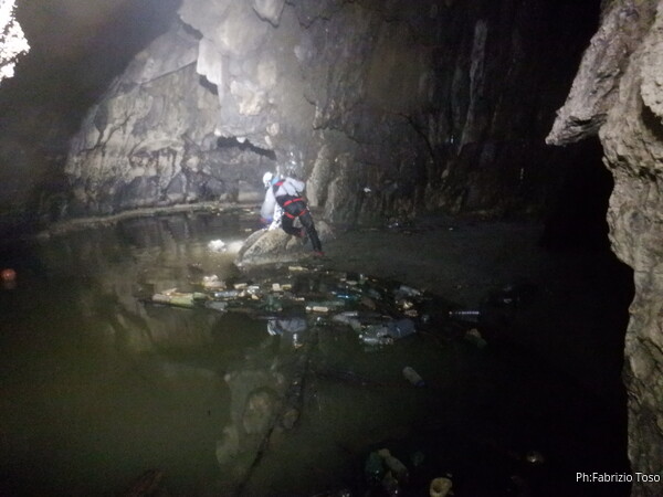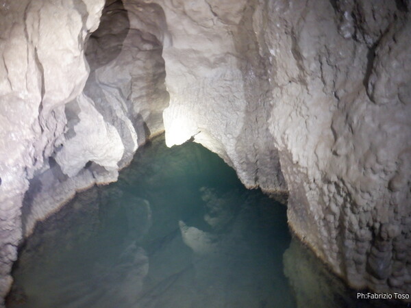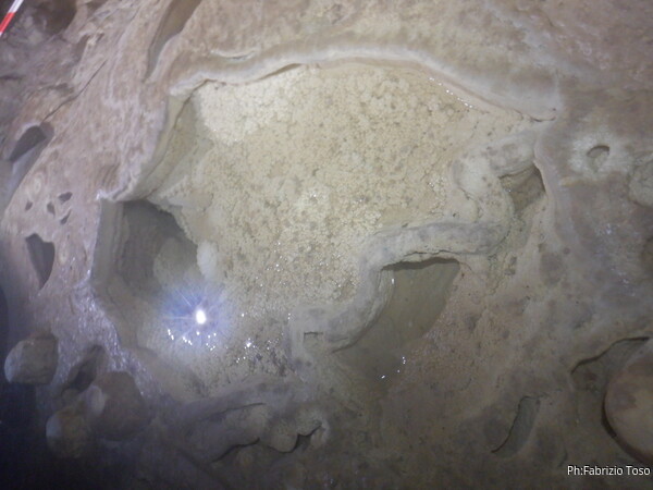 Alla base della monumentale colata calcitica che porta alla risalita per il ramo fossile lasciamo gli zaini. Voglio portare i miei amici a vedere la zona con il sifone finale. Il laghetto finale e’ adorno come al solito di vari reperti di civilta’, ma nemmeno tanti. Anche qua il livello dell’acqua e’ basso, talmente basso che possiamo arrivare alle zone del sifone semplicemente camminando a bordo parete. Riesce a venire anche Giancarlo.