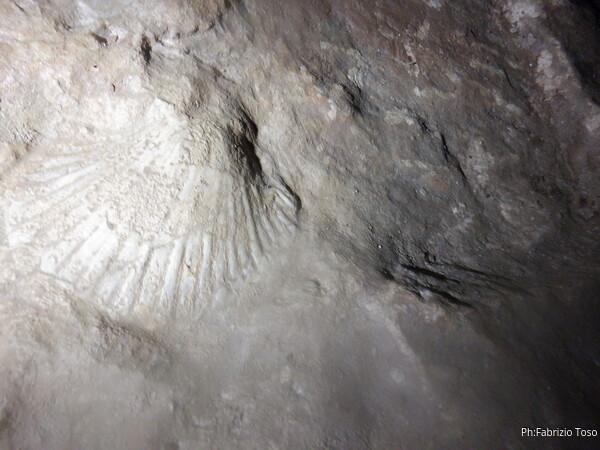 Il tempo per ricompattare il nostro gruppetto, riprendere fiato e siamo pronti per proseguire. Dobbiamo affrontare il salone di crollo prima di poter vedere le meraviglie che nasconde il ramo fossile. Troviamo anche le tracce di una bella conchiglia incastonata nella roccia. Una foto la merita sicuramente.