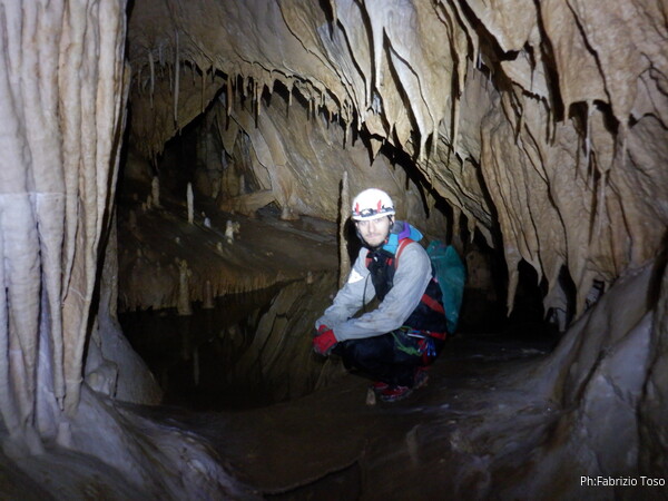 Troviamo un angolino simpatico dove facciamo foto. In verita’ sono anni che dico che voglio esplorare il cunicolo in fondo a questo ambiente ma ogni volta la muta che mi impaccia mi fa desistere. La prima foto e’ per Angelo.