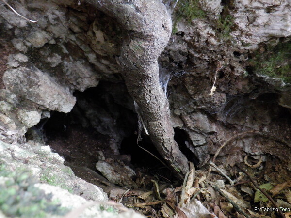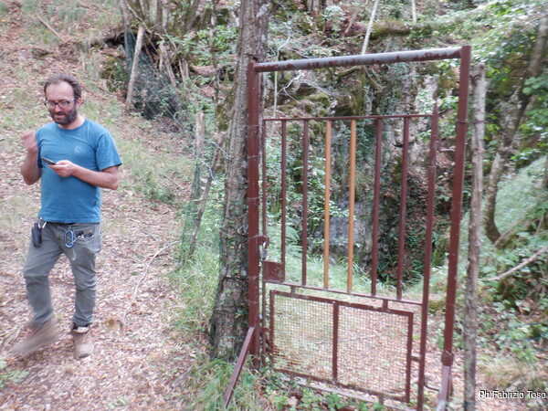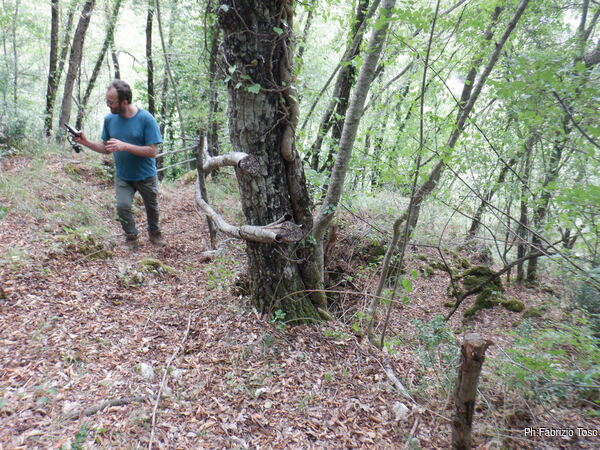Fatto sta, pero’ che la grotta non l’abbiamo trovata. Mentre riprendo fiato elaboriamo il piano B. Andremo con l’auto fino al punto segnato in catasto, o almeno fino a dove riusciamo. Arriviamo fino ad un grande spiazzo che ricordo ma senza sapere perche’. Oltre quel punto la strada diventa impercorribile per la macchina. Ricordo addirittura un fontanile, oggi a secco, in fondo allo spiazzo. Seguendo le indicazioni del GPS andiamo verso di lui e poi proseguiamo tra boschi e rovi. Gabriele mi segue ma continua a dire che secondo lui era meglio seguire la strada…e mannaggia, alla fine risulta che aveva ragione!