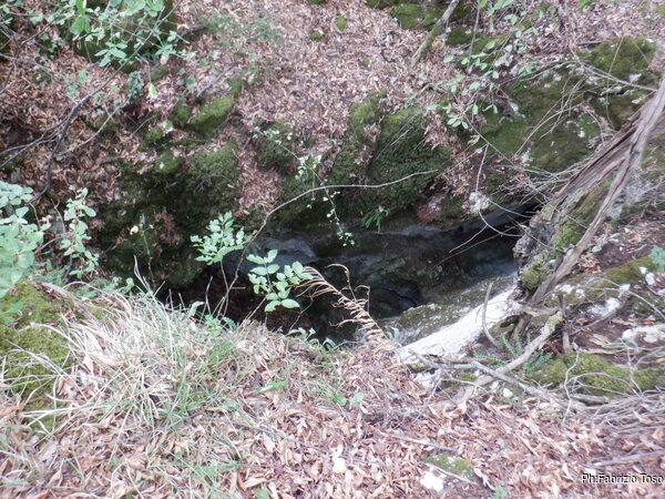 Ci avviciniamo al pozzo cosi’ posso raccontarglielo. Stando la’ davanti mi accorgo di avvertire freddo all’altezza delle caviglie, e’ la corrente d’aria fredda che soffia fuori dalla grotta e scivola vicino a terra come un gelido ed invisibile fiume. Questa osservazione mi sara’ utile nei giorni seguenti ma di questo vi raccontero’ poi.