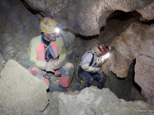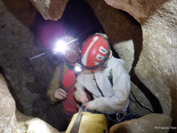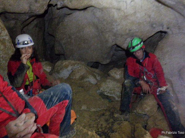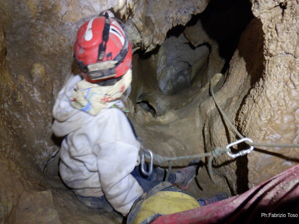 Ecco anche Federico, per sicurezza gli ho fatto portare una corda da 30m. Le corde che sono qua in grotta sono alquanto malandate. E’ molto contento di avere uno zaino grosso quanto lui da portarsi appresso.