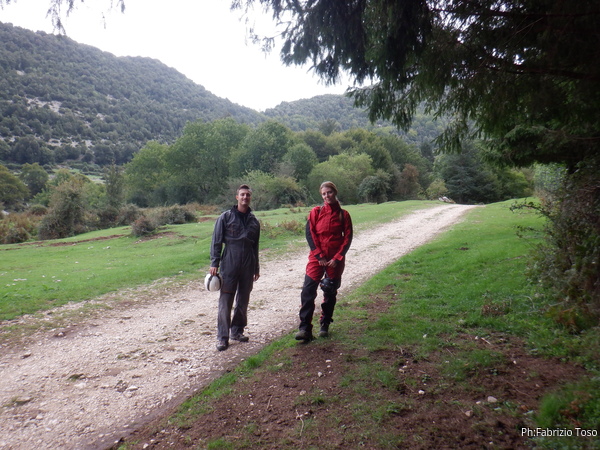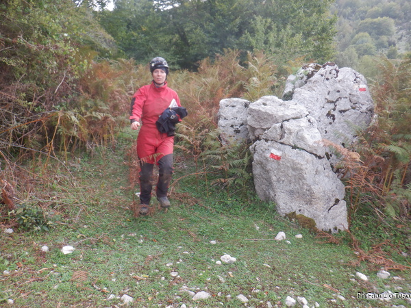 La prima sorpresa della giornata, oltre alla pioggia, la troviamo quando salendo alla grotta troviamo la strada sbarrata da un camion nei pressi dell’Ouso del Sordo. Aspettiamo un poco suonando il clacson ogni tanto nella speranza che l’autista del camion venga a farci passare. Quando capiamo che non c’e’ speranza, torniamo indietro per parcheggiare al primo posto utile. Non ci facciamo scoraggiare dal contrattempo e iniziamo a prepararci.