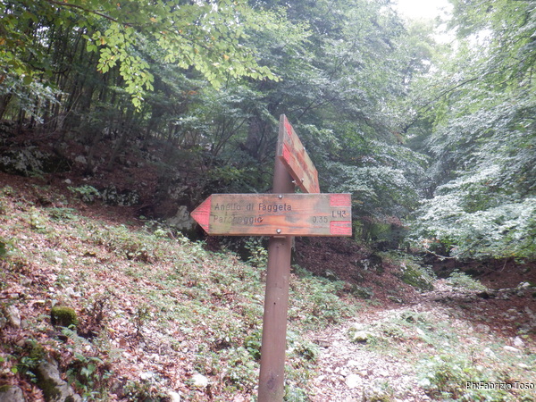 Iniziamo a salire accompagnati da una pioggia sottile e nemmeno troppo fastidiosa. Sali e poi sali passaimo accanto al buco transennato che vedemmo lo scorso inverno. Faccio fare una deviazione a i miei amici per mostrargliela. Ad uno spiazzo sentiamo una voce salutarci dai cespugli. Ci fermiamo per capire a chi appartenga la voce. Esce fuori dai cespugli un simpatico uomo con cui scambiamo qualche parola. In pratica si rivela essere un vecchio speleologo di Carpineto. Probabilmente e’ uno del gruppo di speleo che insieme a Vincenzone formavano la sezione distaccata dello Speleo Club Roma. Lo sollecito a chiamare il gruppo (SCR) se trova qualche buco nuovo, ci parla di uno che esplorarono negli anni ’70 salendo sul Semprevisa. Lo scambio di chiacchiere per quanto piacevole ha termine, ci salutiamo e proseguiamo ognuno per la propria strada. Noi continuiamo a salire. Intrattengo i miei amici con chiacchiere varie e aneddoti su grotte e persone di questi luoghi, spero di non annoiarli troppo. Saliamo. Da un poco ne avevo l’impressione, ma arrivati a un cartello che non ricordo proprio mi rendo conto di aver sbagliato strada. Lo comunico ai miei amici che accolgono la notizia della passeggiata aggiuntiva ed inutile senza scomporsi troppo. Tiriamo fuori dallo zaino il mio fido GPS, imposto il punto della grotta e torniamo indietro.
