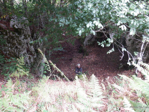 Alla fine la troviamo. Ci fermiamo al bordo della dolina dove avevo preso il punto GPS in origine. Qua ci mettiamo comodi ed inizio il mio noiosissimo spiegone su come si facevano, si fanno e si faranno i rilievi in grotta. Dopo aver tediato abbastanza i miei amici, Angelo scappa giu’ per la dolina.