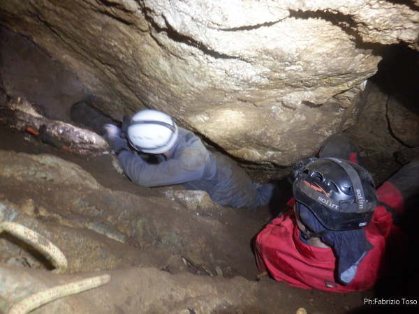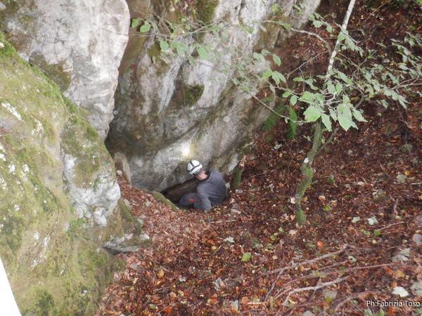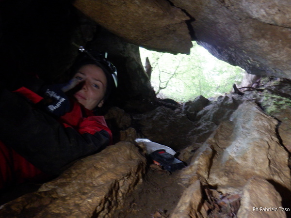 Sistemato quel che serve per il rilievo, scendiamo anche Linda ed io. Angelo e’ gia’ affacciato alla grotta.