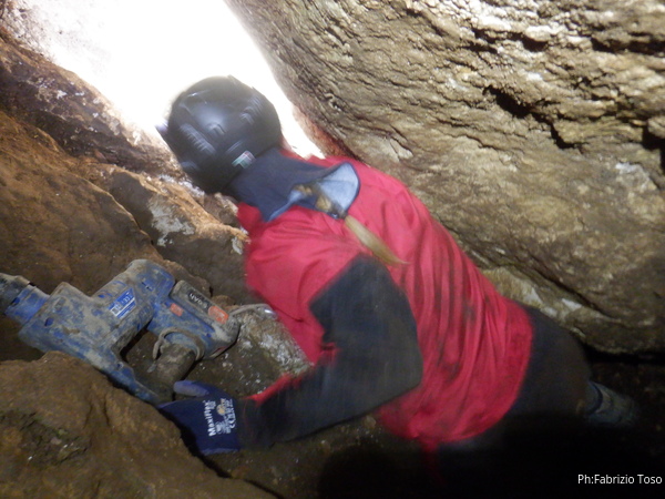 Quando tornano con cofana, mazzetta, maleppeggio, scalpello, cazzuola e demolitore io ho terminato col rilievo e sono fuori ad attenderli. Torniamo indietro nella grotta per scavare.