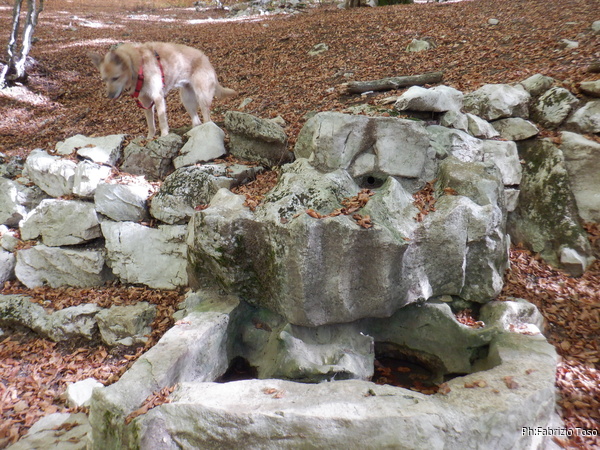 Luna guarda sconsolata la sorgente dell’Innola che purtroppo e’ a secco. Per consolarla le porgo un poco di pappa e una buona dose di acqua.