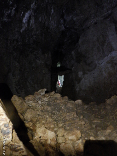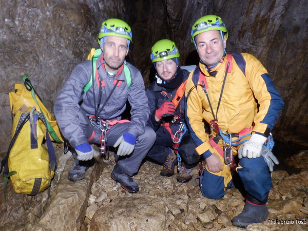 Trovo Giulio gia’ dentro, sta attrezzando il primo saltino. Facciamo una rapida revisione del materiale poi prendo lo zaino per il P13, quello che si incontra prima di arrivare al piu’ celebre P19.