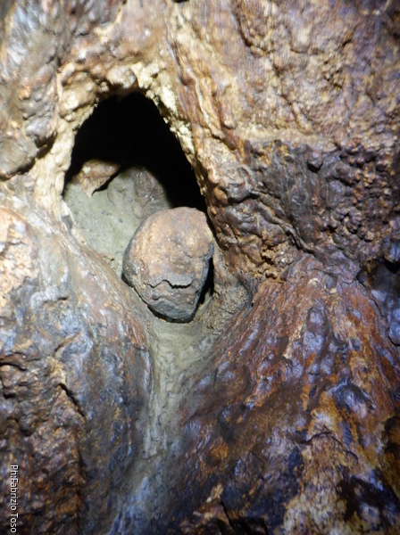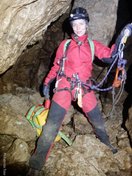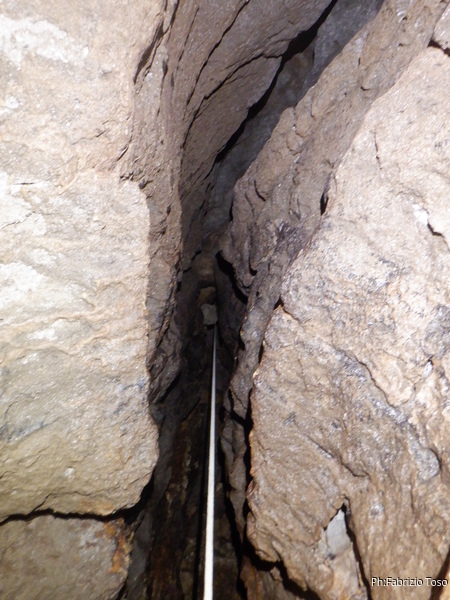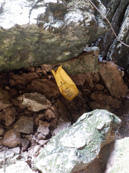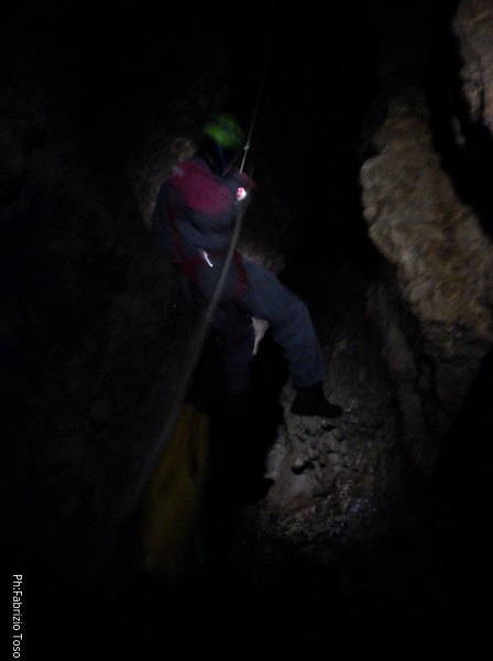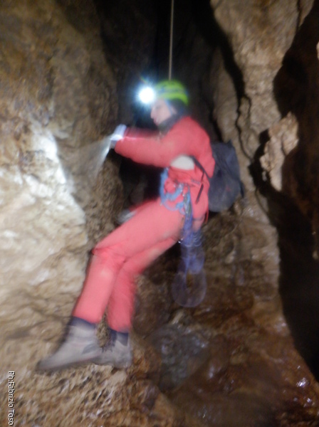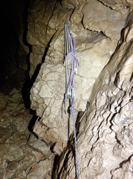 Risalendo il P13 trovo l’armo modificato. Passato il frazionamento intermedio la corda va a fare pressione su un sasso incastrato tra le strette pareti del pozzo. Oltre a potersi lesionare la corda c’e’ pericolo che il sasso, spinto dalla corda, si disincastri cadendo sul malcapitato speleologo che sale. Un aspetto di cui tenere conto per il futuro.