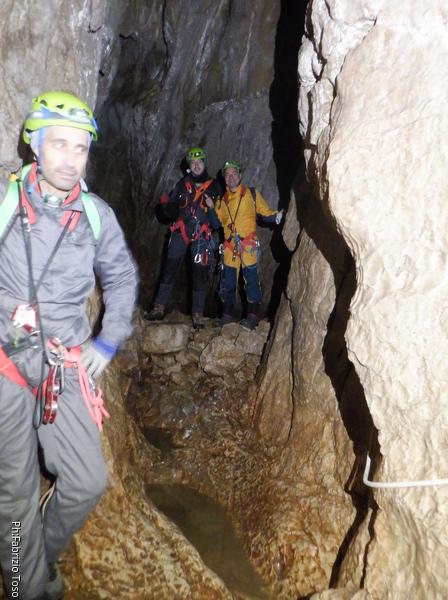 Arrivati in fondo al P13 Linda si occupa di armare anche il successivo P4 poi andiamo a vedere cosa succede al salto successivo, quello con la malefica pozza e la successiva discesa fino alla sala del teschio. Trovo degli allievi scesi dal P19, faccio loro una foto.
