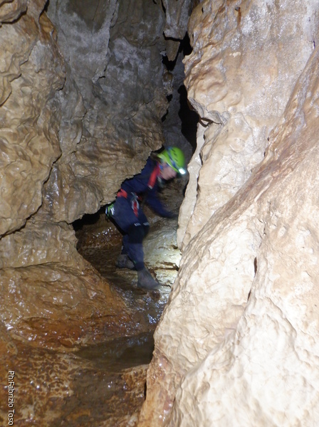 Trovo Giulio che istruisce Angelo su come armare il passaggio della malefica pozza. E’ un armo che comporta arrampicarsi un poco ma Angelo se la cava benone.