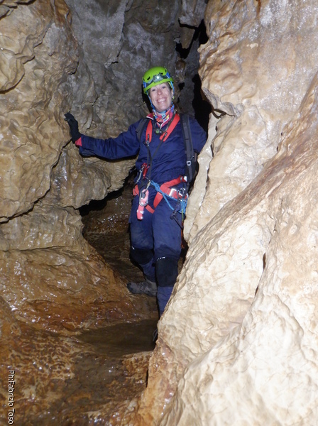 Torno indietro fino alla base del P4 dove ritrovo Linda e il suo bel sorriso. Praticamente l’armo che le ho richiesto di fare sembra sia stato giudicato non adeguato. Linda smonta tutto l’armo fatto perche’ si possa recuperare la corda e rendere l’armo adatto ad un corso. Come dico spesso, c’e’ sempre da imparare a questo mondo, imparero’. Lascio Linda al suo lavoro e vado a far sicura alla base del P19.