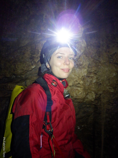 Sono al frazionamento successivo, nell’attesa che Linda mi raggiunga, faccio foto a casaccio. Mi faccio piccolo piccolo in un anfratto e seguo Linda mentre arma il frazionamento. Il pozzo quasi non avrebbe bisogno del frazionamento, ma siamo ad un corso e i nostri allievi si devono esercitare. Visto l’angolo quasi nullo tra la direzione della corda in arrivo e quella che riparte dal frazionamento dico a Linda di utilizzare un solo attacco e lei esegue senza problemi.