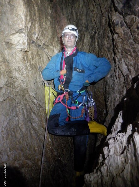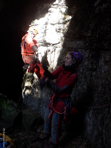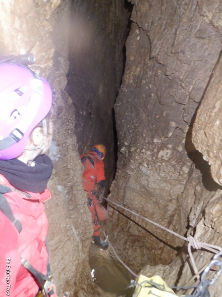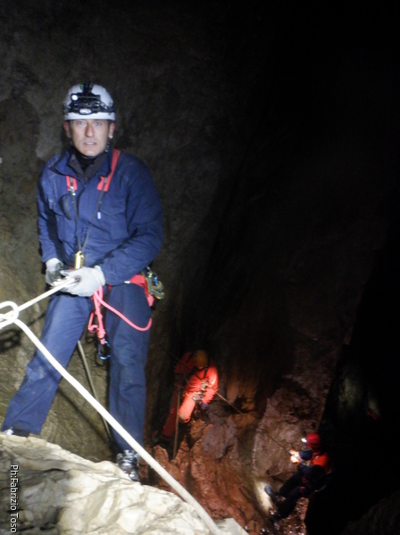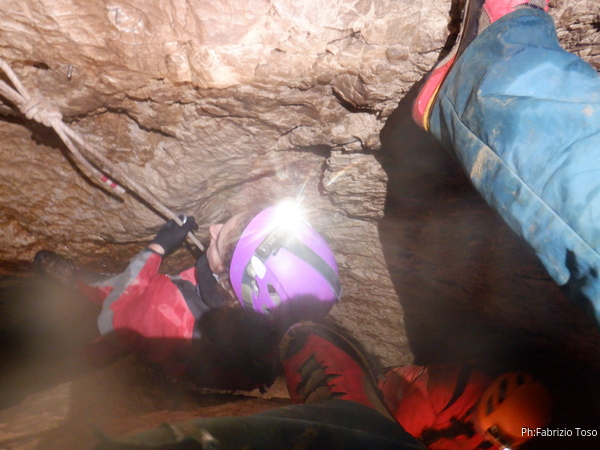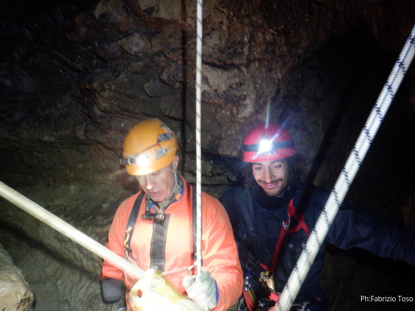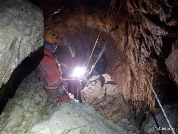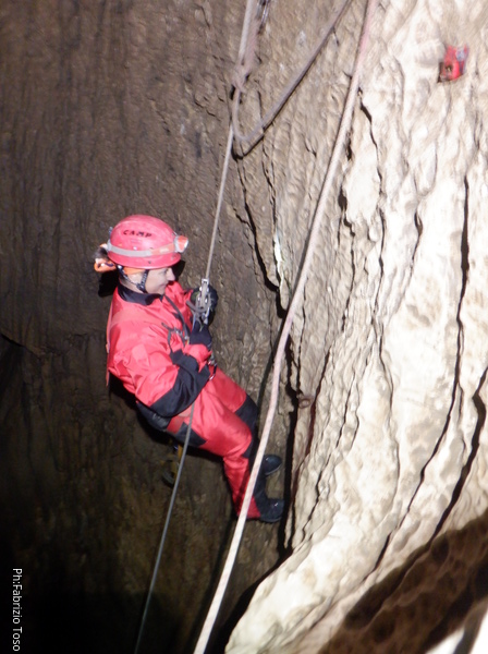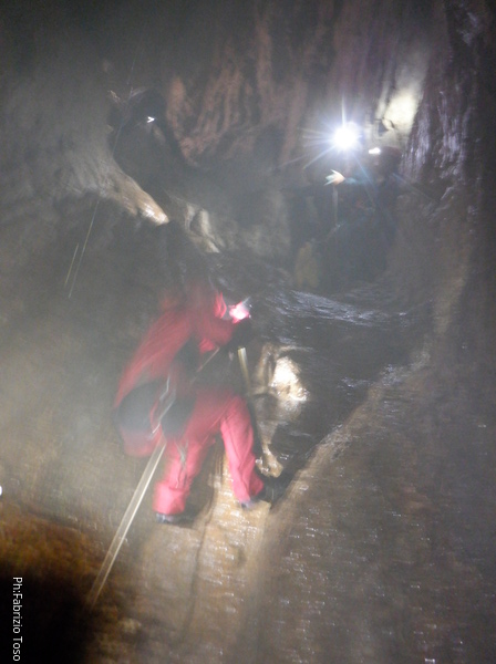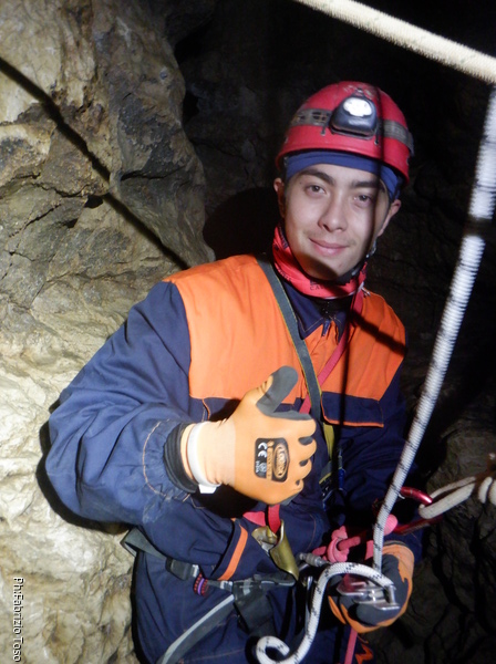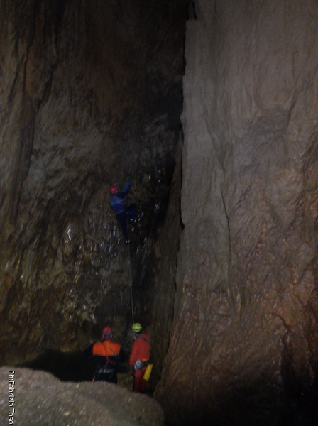 E’ tutto pronto, Max e Flaminia scendono svelti e io mi piazzo alla partenza del pozzo per seguire gli allievi. Giuseppe e’ il primo a cimentarsi e se la cava senza problemi.