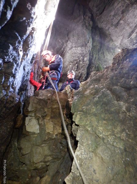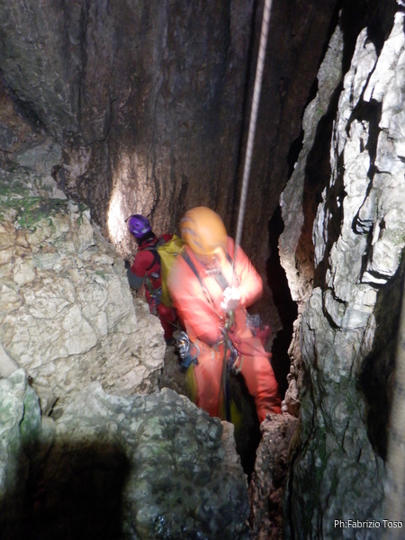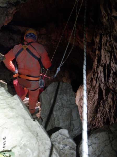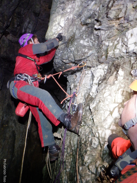 Si scala di un posto. Tocca a me salire. Raggiungo Stefano al frazionamento intermedio lasciando cosi’ che lui salga alla partenza del pozzo.