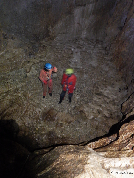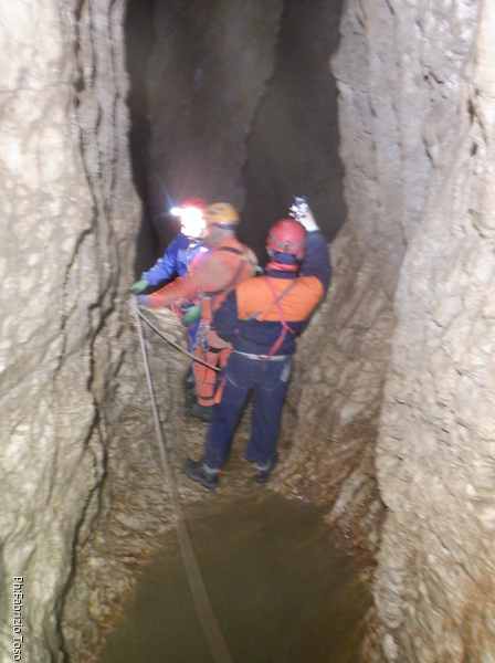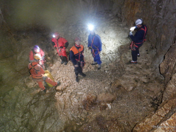Scesi alcuni allievi anche noi istruttori ci muoviamo, scalando tutti di un posto. Io raggiungo Stefano alla base del pozzo e Fabio prende il mio posto. Netta rimane alla partenza del P19.