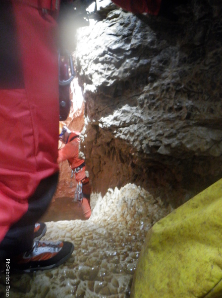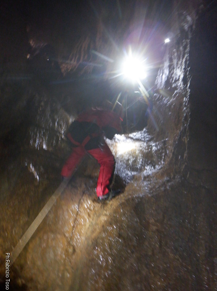 Durante il passaggio di uno degli allievi la corda di risalita rimane incastrata su uno spuntone di roccia davanti alla partenza. Sul momento non me ne accorgo, sono impegnato ad accompagnare l’allievo di turno fuori dal pozzo. Quando mi affaccio di nuovo sul pozzo vedo la corda incastrata…Purtroppo Giuseppe, era il suo turno per salire, e’ gia’ sulla corda. Devo decidere alla svelta, non posso sistemare la corda senza fargli prendere uno spavento, cadrebbe per un metro abbondante. Spiegare la situazione e farlo scendere mi sembra una soluzione complessa e non priva di rischi. Il tutto si svolge in pochi secondi, alla fine decido, aggancio la corda con la mia longe e la uso per deviarla in maniera che non sfreghi sulla roccia. Cosi’ facendo salvo allievo e corda ma devo subire le vivaci proteste di Giuseppe quando arriva su. Infatti il mio deviatore lo ha costretto a salire sotto la cascatella che si genera alla partenza del pozzo. Il vederlo fradicio come un pulcino e abbastanza arrabbiato mi fa sia sentire in colpa che sorridere per il pericolo scampato. Dopo questo “inconveniente” non tralascio di controllare la corda prima che venga data la libera e prima di accompagnare l’allievo di turno fuori dal pozzo. Si riprende con le salite, ecco Yassin che arriva.