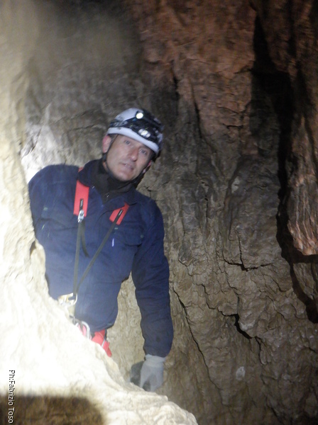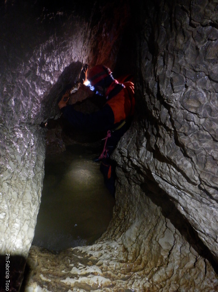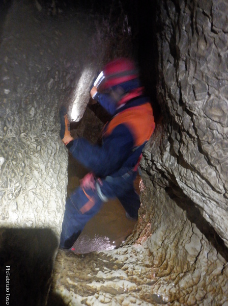 Il serpentone scorre ancora in avanti, oramai qualcuno stara’ gia’ salendo il P19. Mentre passo la pozza malefica vengo raggiunto anche da Max. La pozza rispetta la bassa opinione che ho di lei, mentre salgo mi sfugge un piede e plano col sedere a pelo d’acqua. Vengo salvato dalla mutanda in PVC che ho indossato oggi per isolarmi dalle pareti umide della grotta.