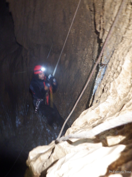 Questione di pochi minuti e il pozzo e’ armato. Il serpentone riparte prontamente. Scendo per primo e mi fermo al frazionamento intermedio. Stefano, mi raggiunge e seguita fino alla base del pozzo. Iniziano ad arrivare gli allievi. Ecco Luca mentre riparte per la seconda meta’ del pozzo.