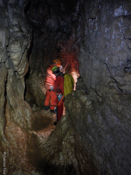 Scendo, non scendo…Ma si, scendo. A un Marilu’ non si puo’ rinunciare. Trovo tutti riparati alla partenza della risalita laterale, l’unico punto con un poco meno stillicidio. Max sta preparando un brodino caldo. Li raggiungo.