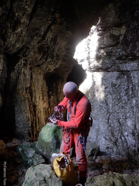 Arrivati in grotta Max inizia i preparativi per l’armo e io termino di indossare la mia attrezzatura.