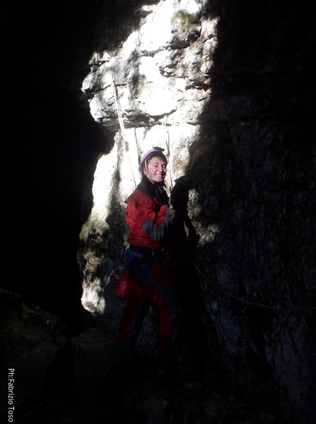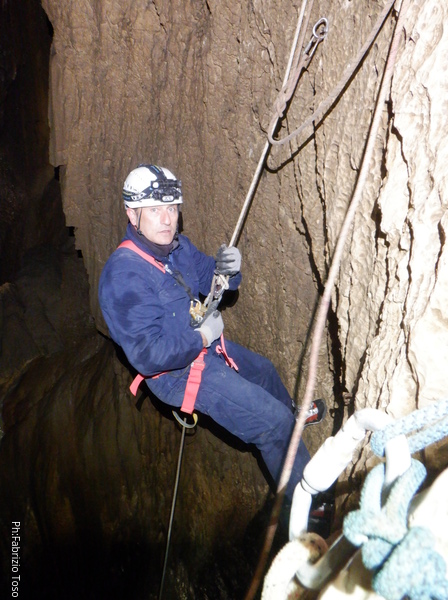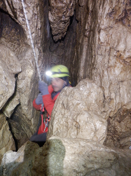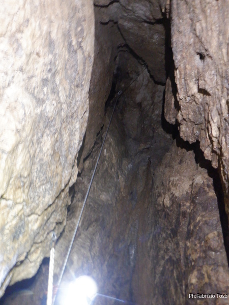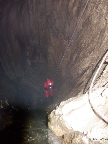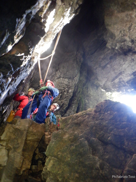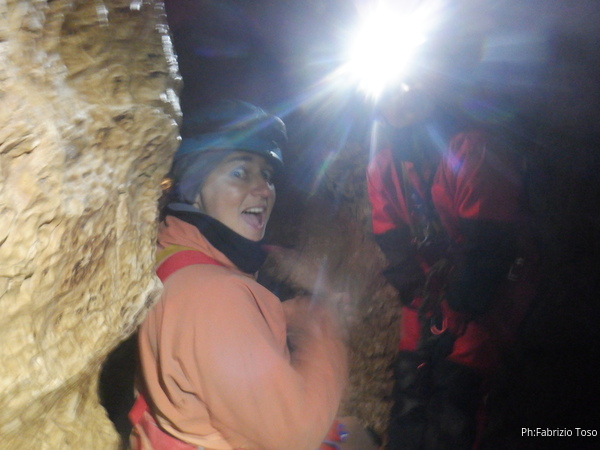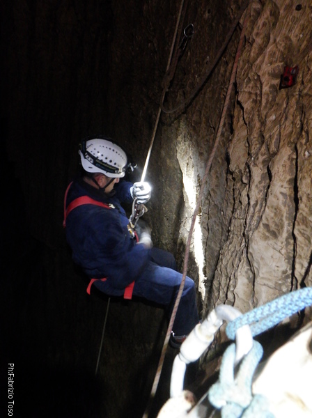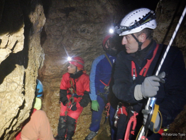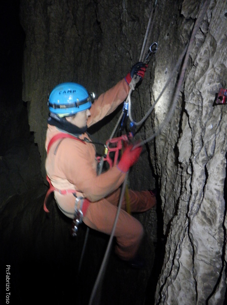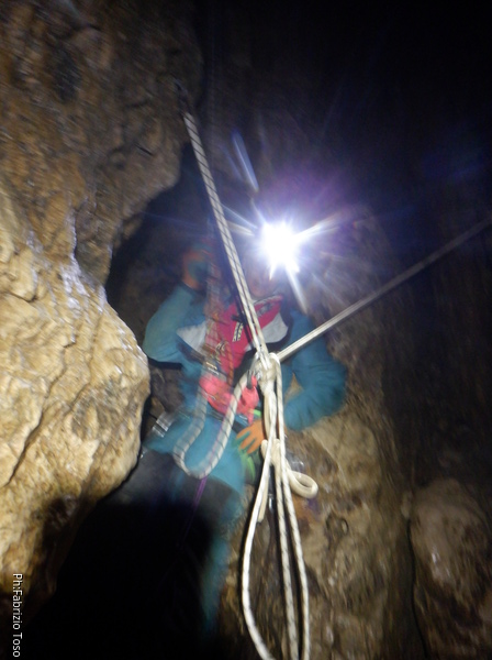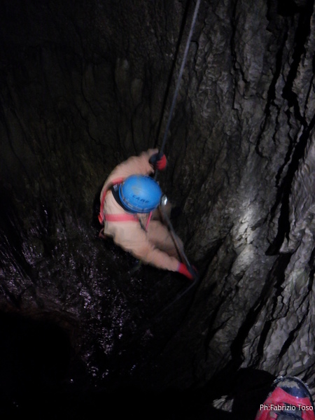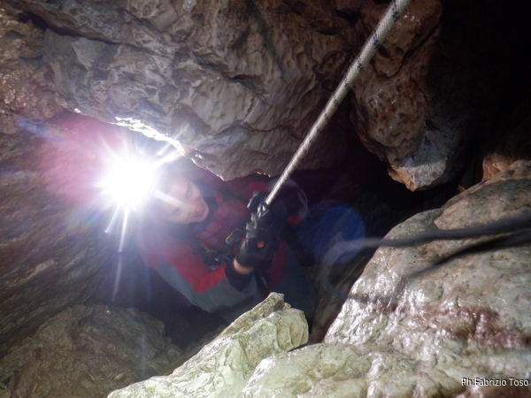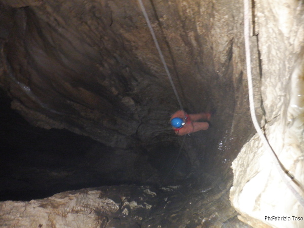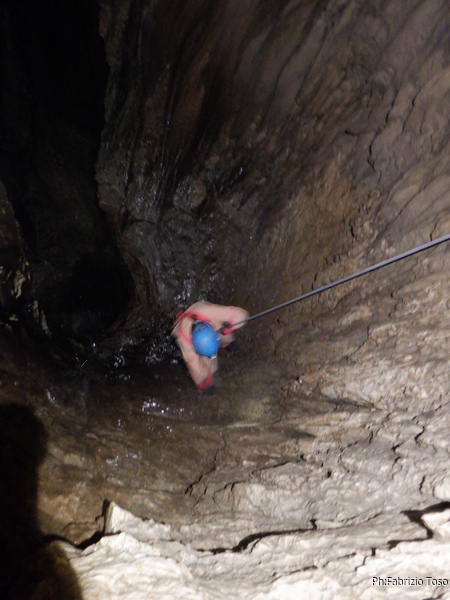 E’ tutto pronto, Max e Flaminia scendono svelti e io mi piazzo alla partenza del pozzo per seguire gli allievi. Giuseppe e’ il primo a cimentarsi e se la cava senza problemi.