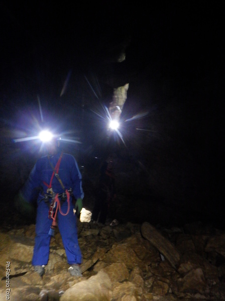 Scendo, non scendo…Ma si, scendo. A un Marilu’ non si puo’ rinunciare. Trovo tutti riparati alla partenza della risalita laterale, l’unico punto con un poco meno stillicidio. Max sta preparando un brodino caldo. Li raggiungo.