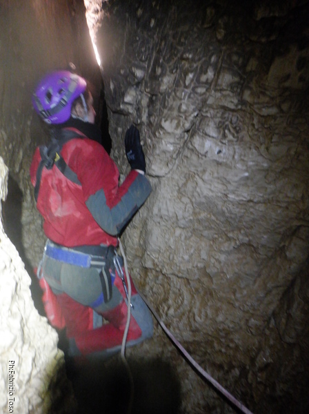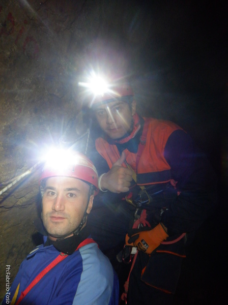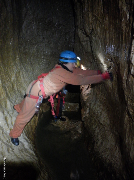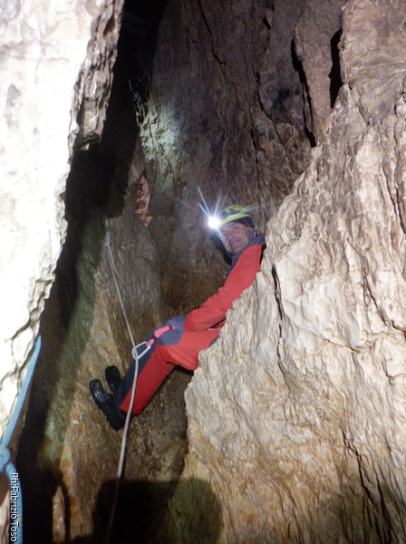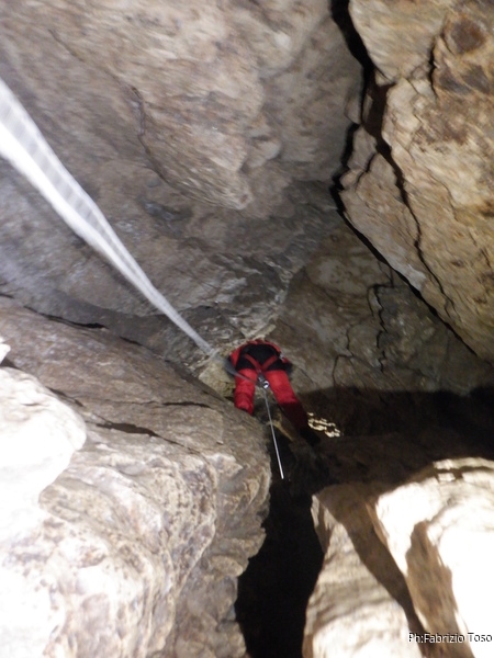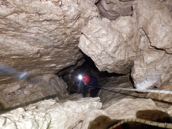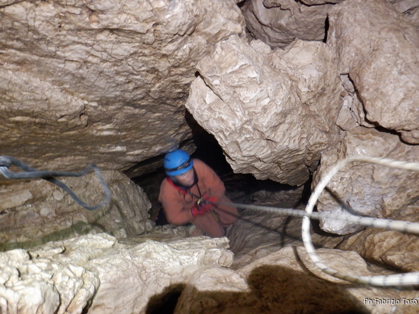 Si scala di un posto. Tocca a me salire. Raggiungo Stefano al frazionamento intermedio lasciando cosi’ che lui salga alla partenza del pozzo.