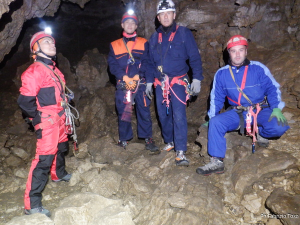 Scesi alcuni allievi anche noi istruttori ci muoviamo, scalando tutti di un posto. Io raggiungo Stefano alla base del pozzo e Fabio prende il mio posto. Netta rimane alla partenza del P19.