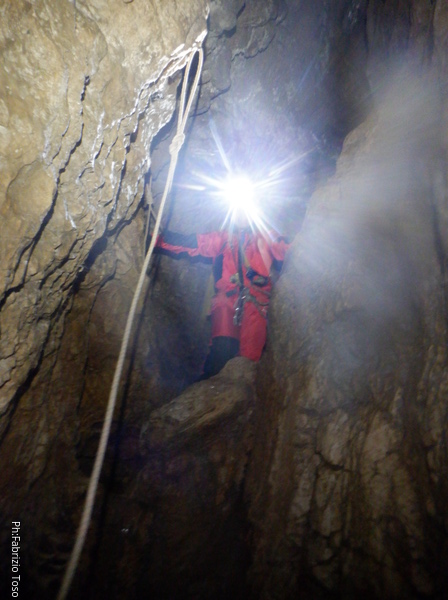 Questione di pochi minuti e il pozzo e’ armato. Il serpentone riparte prontamente. Scendo per primo e mi fermo al frazionamento intermedio. Stefano, mi raggiunge e seguita fino alla base del pozzo. Iniziano ad arrivare gli allievi. Ecco Luca mentre riparte per la seconda meta’ del pozzo.
