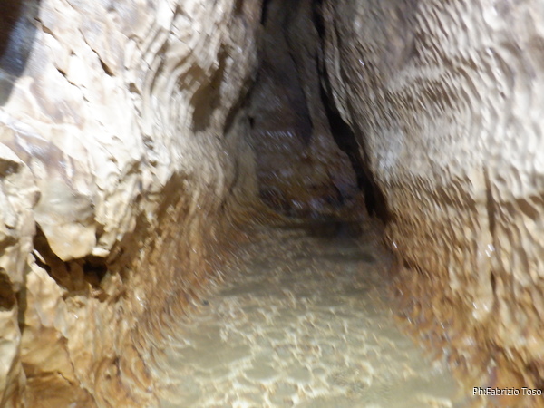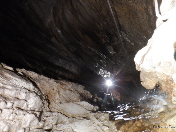 Altro cambio di posto e anche io sono alla base del pozzo. Quella che segue, fino al Marilu’, e’ la parte piu’ scenografica della porzione di grotta che percorreremo oggi, il meandro con le sue forme contorte mirabilmente scolpite dalla natura, l’acqua e il tempo.