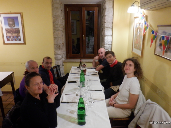 Dopo la gradita merenda ci cambiamo svelti prima che il freddo ci catturi nuovamente. E’ quasi ora di cena, siamo a Carpineto Romano, dove si puo’ andare se non alla Sbirra?!? Eccoci infatti, pochi ma buoni ad allietarci con le delizie di questo nostro amato ristorante e la simpatica compagnia degli amici che lo gestiscono.