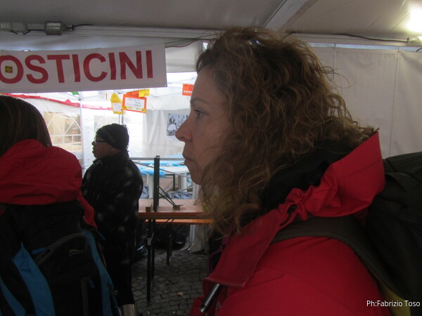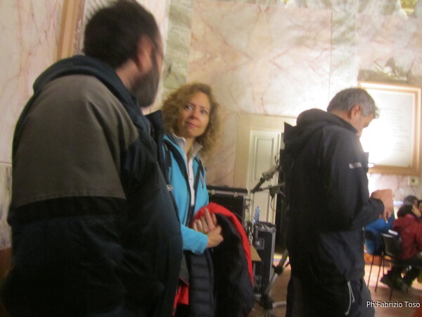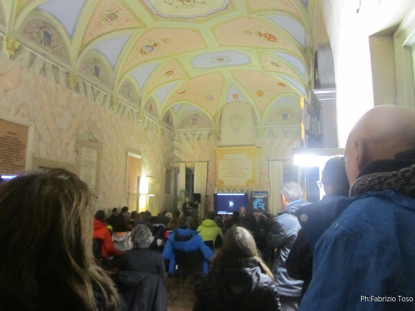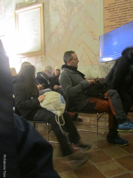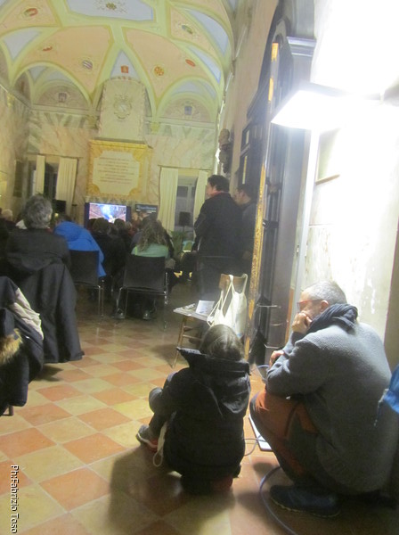 Quando e’ l’ora ci avviamo. Arriviamo che la presentazione precedente e’ ancora in corso. Ci sistemiamo pazienti in fondo alla sala.