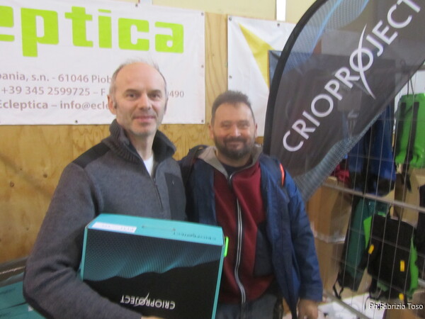 Ben contento continuo col mio giro. Mi fermo a chiacchierare di lampade con il ragazzo allo stand della e-thin. E’ un tipo di lampada che mi attira per la leggerezza, per ora faccio nulla ma probabilmente un giorno ne comprero’ una. Mentre faccio per allontanarmi vedo una faccia nota allo stand alla mia destra insieme a delle scarpe che conosco bene, le Gaibana. Mi fermo a far chiacchiera anche con lui. Nemmeno a dirlo parliamo di scarpe. E’ parecchio tempo che medito di comperare proprio quel paio di scarpe ma il costo mi ha sempre un po’ spaventato. Pero’ devo comperare un paio di scarpe, quelle che ho utilizzato finora si sono aperte in punta e tra poco saranno inservibili. Avevo gia’ comprato le Gaibana, il primo modello, e devo dire che sono durate parecchio. Quando mi convinco a provarle gia’ so che cedero’…e infatti eccomi qua con la scatola delle mie scarpe nuove e il colpevole dello sconsiderato acquisto, la stessa persona che mi aveva convinto a comprare il primo modello. La storia si ripete e la celebriamo con una foto.