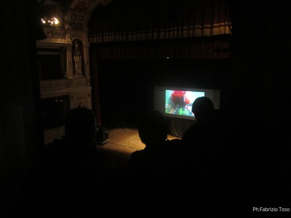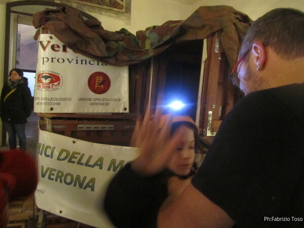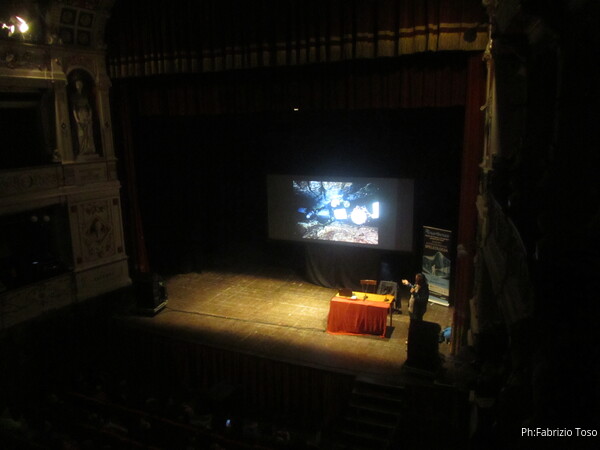 Chiamo Gabriele e Giuseppe, loro sono a teatro a vedere una presentazione sulle esplorazioni speleosubacquee. Li raggiungo e seguo con loro la presentazione.