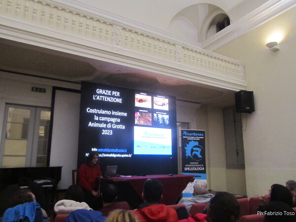 Quasi alla fine della presentazione abbandoniamo la nostra postazione per spostarci al “ridotto del teatro” dove si tiene un incontro sugli animali di grotta e in particolare su quello alla ribalta per il 2023, il niphargus, che descriverei come un minuscolo gamberetto albino sperando di non urtare la sensibilita’ di nessuno!
