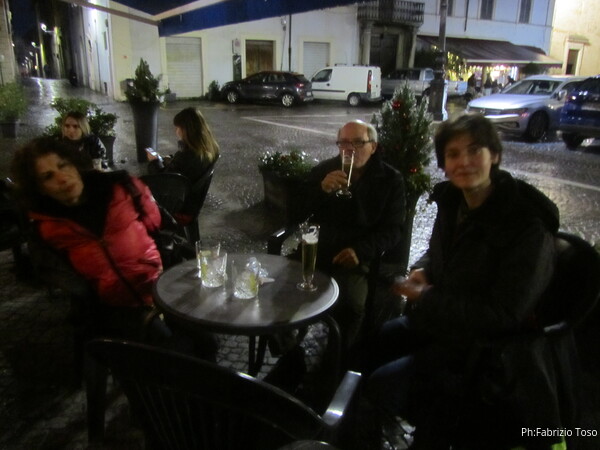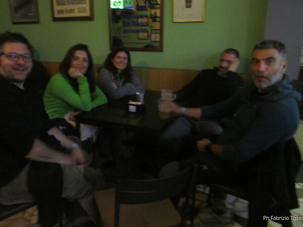 Dopo una scorpacciata di cultura andiamo a rifocillarci con un aperitivo al bar del teatro dove oramai siamo di casa. Con noi ci sono anche Laura, Pietro e Giancarlo. In compenso Gabriele si e’ perso da qualche parte, ma nei raduni funziona cosi’, si sa e non ce ne facciamo un cruccio.