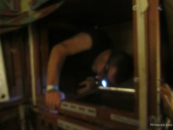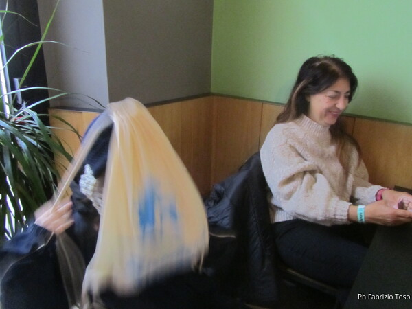 Anche questa volta non resisto e il mio pranzo inizia con il frico e polenta e termina con un ottimo cannolo. Dopo il lauto pasto Betta, io e Luna ci separiamo dal gruppo per un meritato riposo. Stavolta pero’ mi metto la sveglia perche’ ho solo un’ora a disposizione. All’ora stabilita mi ritrovo al bar del teatro con Federico e Diana, dopo un caffe’ propiziatorio ce ne andiamo nei pressi della segreteria dove Diana si vuole cimentare col “fessurometro”, una specie di meandro stretto e tortuoso ricostruito con dei geniali cubi di legno connessi tra loro.