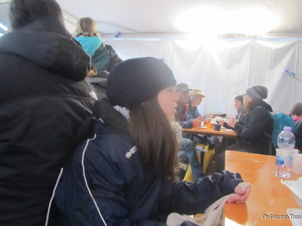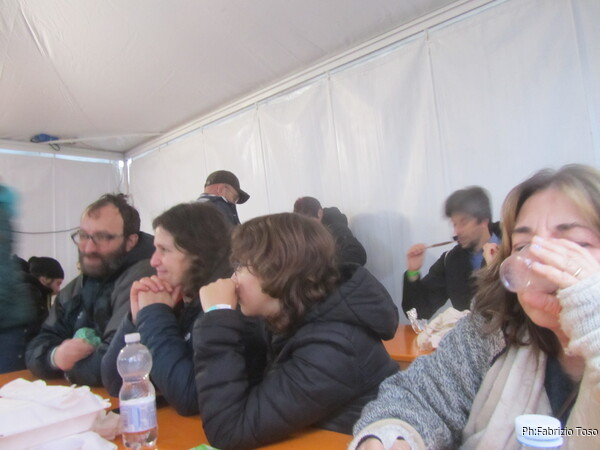 Faccio solo un’altra rapida sosta per acquistare un paio di moschettoni “da longe” e poi ben contento torno indietro. Con Betta ci coordiniamo perfettamente, mentre mi avvio all’uscita lei mi chiama. Con Luna riaffronto il ponte burrascoso e vado a raggiungere Betta, poi insieme facciamo un’incursione allo speleobar per il pranzo. Dopo una attenta disamina delle specialita’ a disposizione ricado di nuovo sul mio piatto preferito, il frico con la polenta, il mio pasto viene coronato e completato da un gustosissimo cannolo siciliano. Dopo pranzo ci ritiriamo in stanza per un riposino.