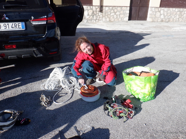Quando e’ giu’ gli tiro sotto le corde e poi mi dedico ad Alessia che oggi riprende confidenza con l’attrezzatura dopo una sosta di qualche mese. Ripassiamo velocemente l’uso del discensore ma vedo che nonostante qualche incertezza iniziale se la cava benone e non ha timori evidenti. Bene.