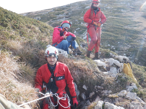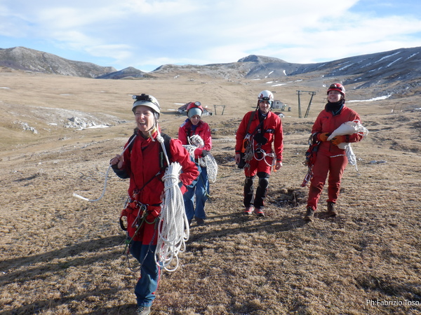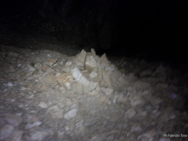 Aspetto che Luca esca poi lo aiuto a sistemare il materiale e quindi partiamo a nostra volta verso le macchine. Ad un certo punto Luca mi fa notare delle lucine sul monte a fianco. ma sono le nostre 3 eroine. Probabilmente hanno cercato di seguire a ritroso la strada fatta all’andata ma non la ricordavano molto bene e ora sono su una direzione decisamente sbagliata. Con qualche urlo le indirizziamo nuovamente per la retta via verso l’auto e poi proseguiamo anche noi.